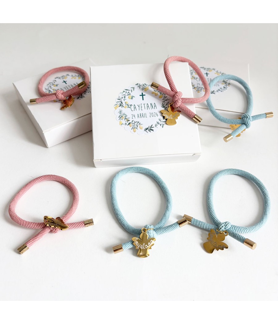 Cada pulsera se presenta en su cajita y viene con un medallón que personalizamos con el nombre del niño y la fecha de la celebración. Puedes elegir el medallón que más te gusta.