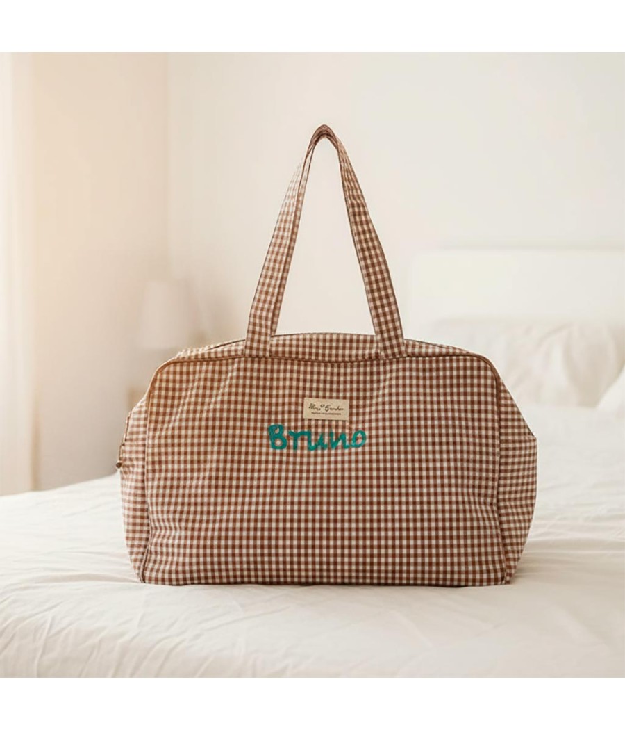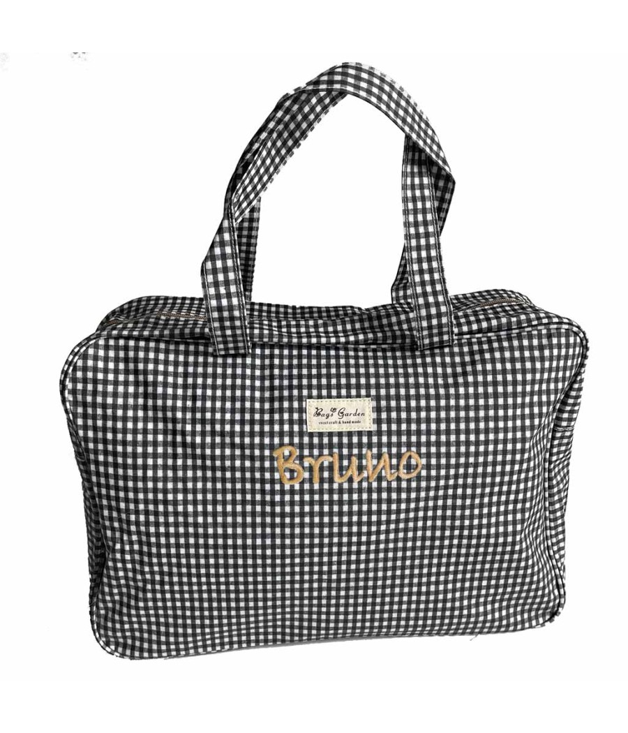 Maleta o bolsa plastificada de diseño vichy para llevar la ropita del bebé al hospital o para un fin de semana. Puedes bordarla con el nombre del bebé si quieres, no retrasa la entrega del regalo. Con bolsillo exterior y dos interiores. Con asas cortas y un asa larga.
