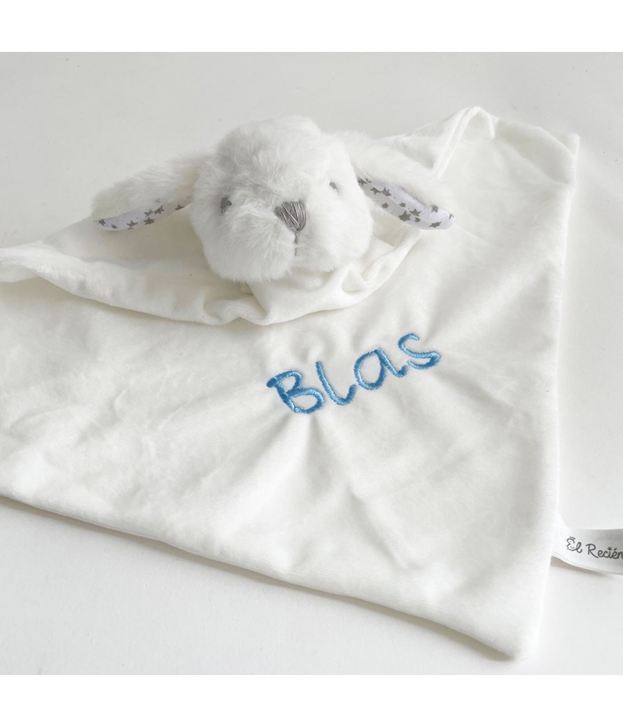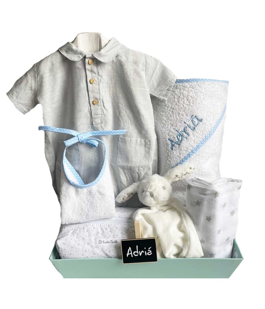 Canastilla bebé con ropita de bebé en tonos blancos y celestes. Puedes bordar el nombre del bebé en la capa de baño, babero o doudou, no retrasa la entrega de la canastilla.
