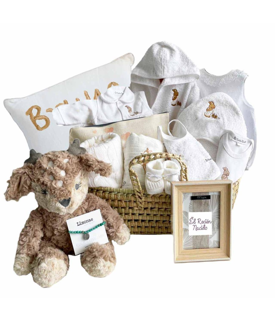 - Presentado en moisés de mimbre grande y envuelto con celofan y lazo