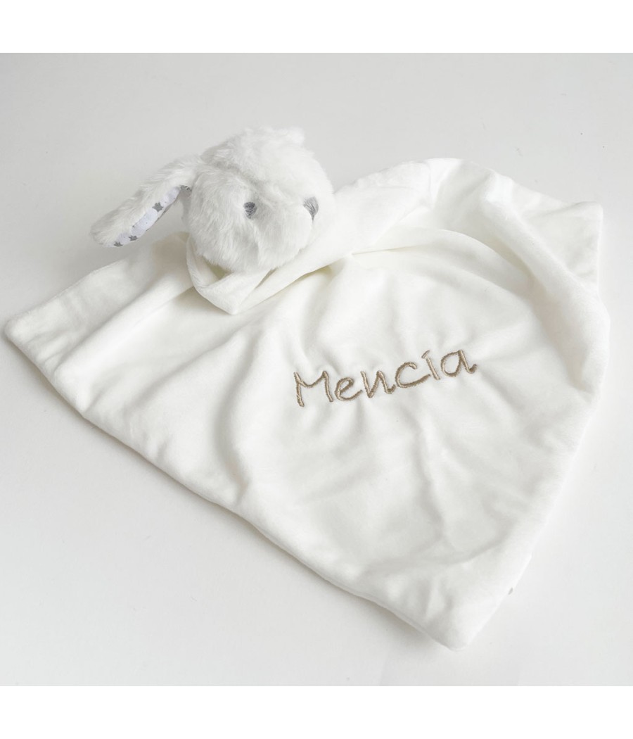 Podemos bordar el nombre del bebé en la manta, capa de baño, doudou y babero (no retrasa la entrega del regalo).