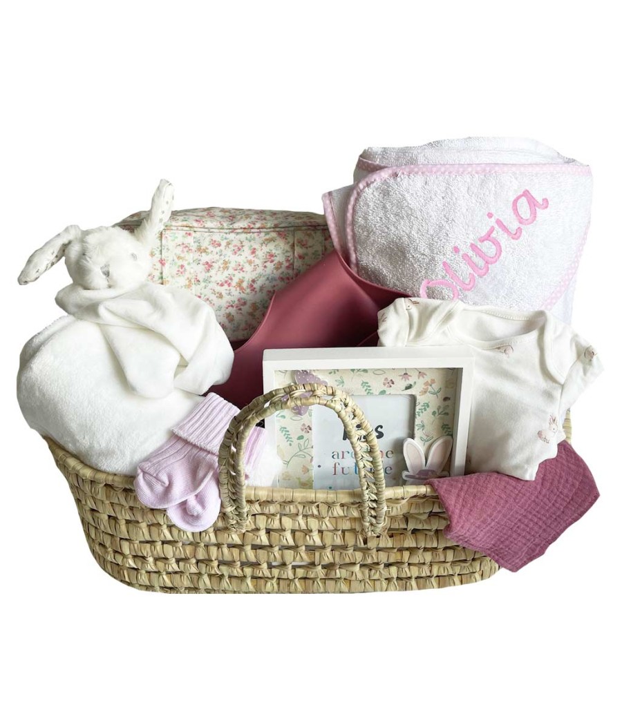 - Presentación en moisés de mimbre grande envuelto con celofán y lazo