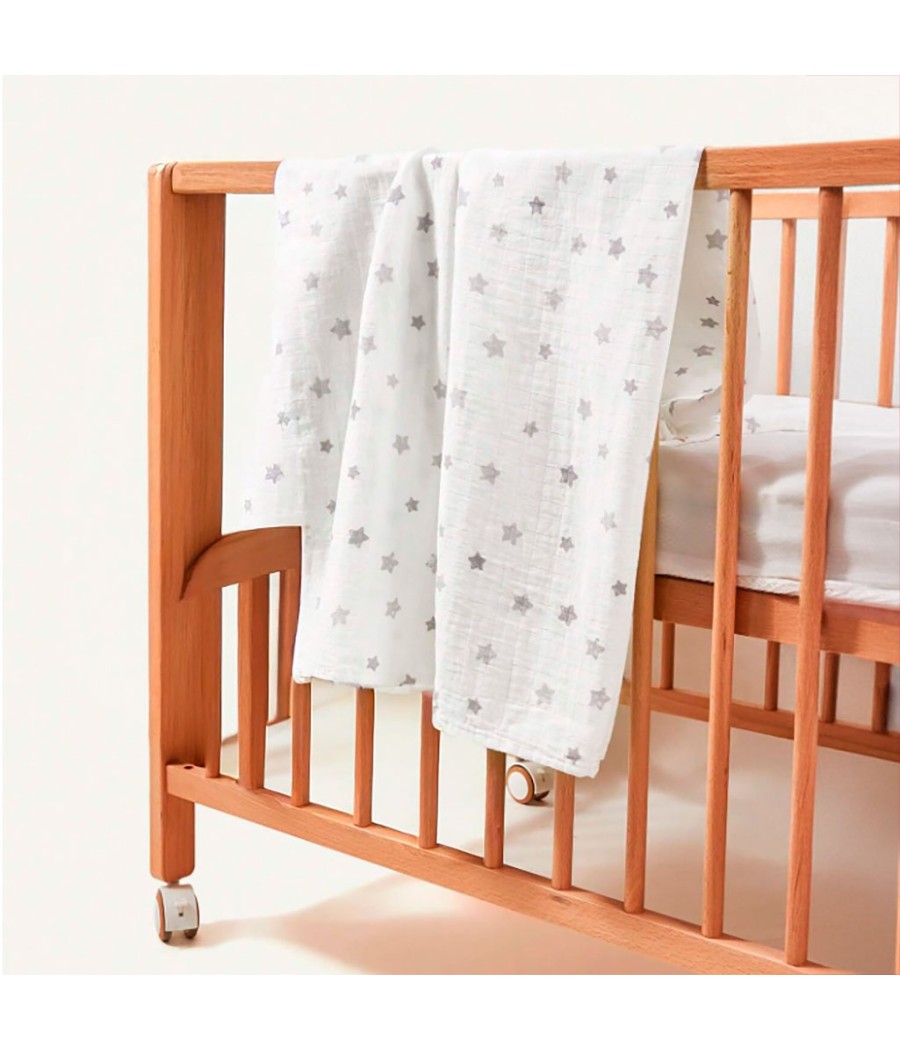 Prácticas y divertidas muselinas de algodón con un estampado de estrellitas grises. Muselinas de 120cm x 120cm