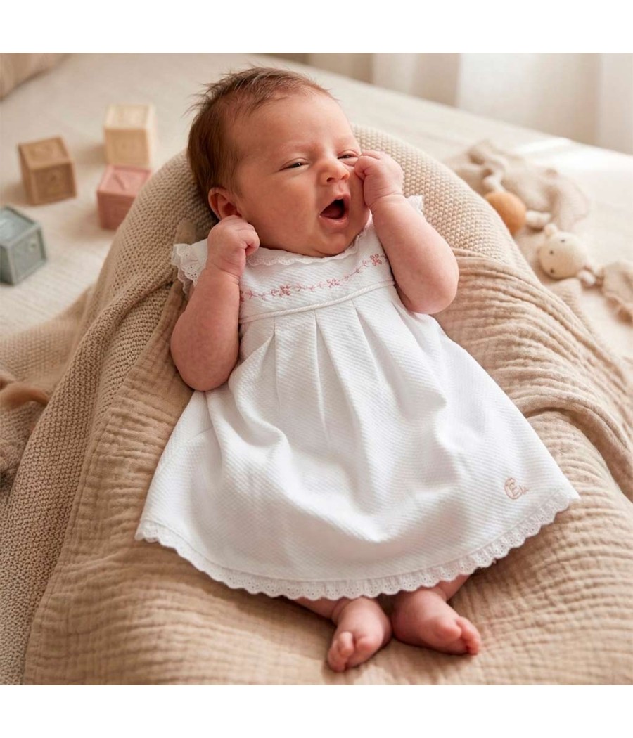 Vestido de piqué blanco de manga corta. Con cinta bordada en el cuello y las manguitas. Florecitas bordadas en beige en el pecho y botones en el pecho.