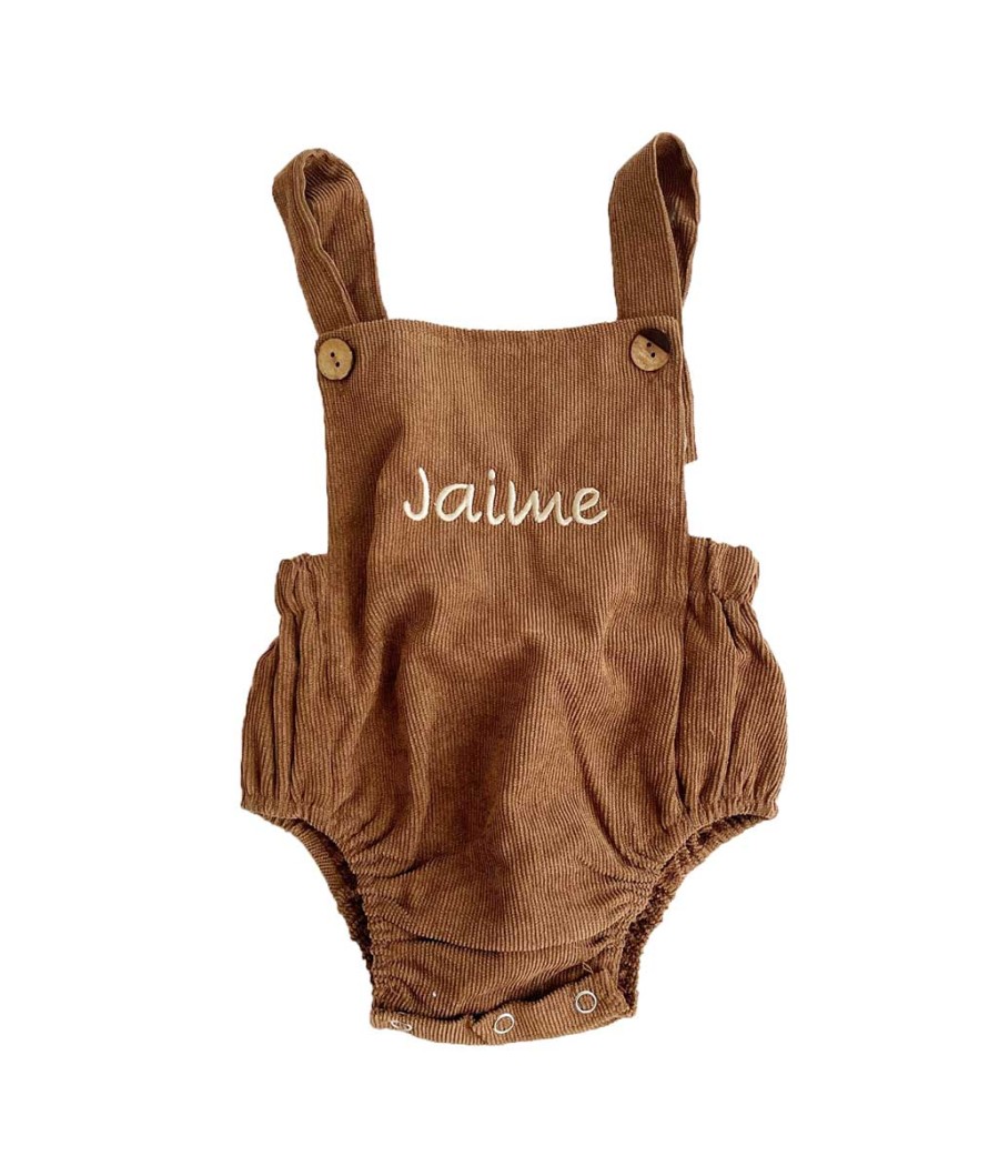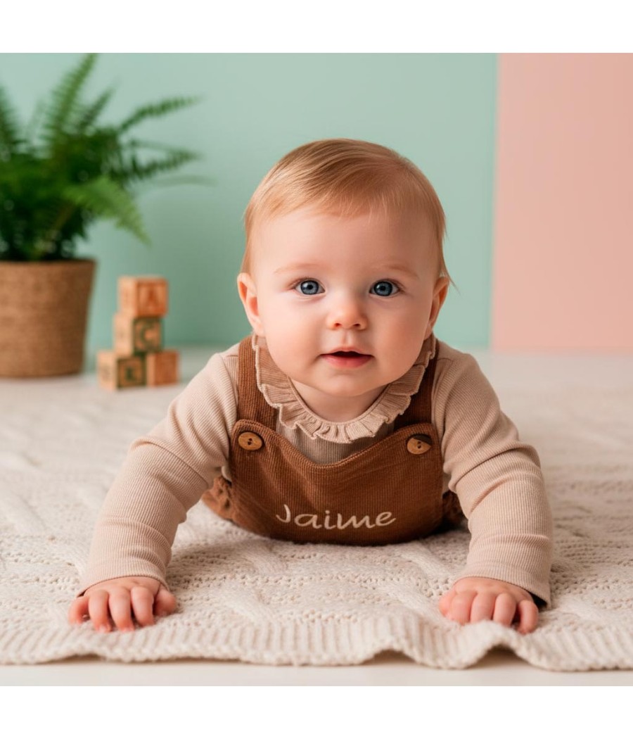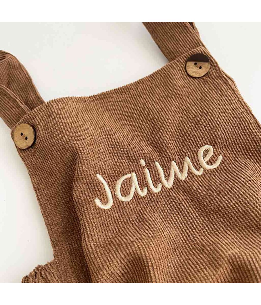 Ranita o pelele de pana en marrón chocolate. Tirantes con botones de madera en color camel. Ideal para combinar con una camisa, rebeca y leotardos. También tiene corchetes en la parte inferior para facilitar el cambio de pañal.