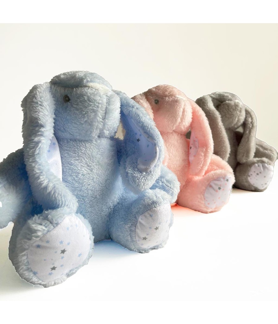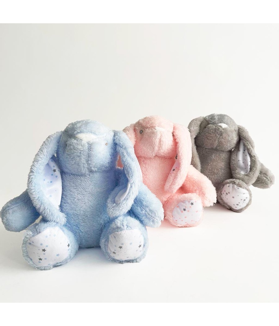 Conejo de peluche super suave disponible en 3 colores. Puedes bordar el nombre del bebé en la oreja del peluche. Ideal para añadir a canastillas o regalar suelto a bebés y niños.