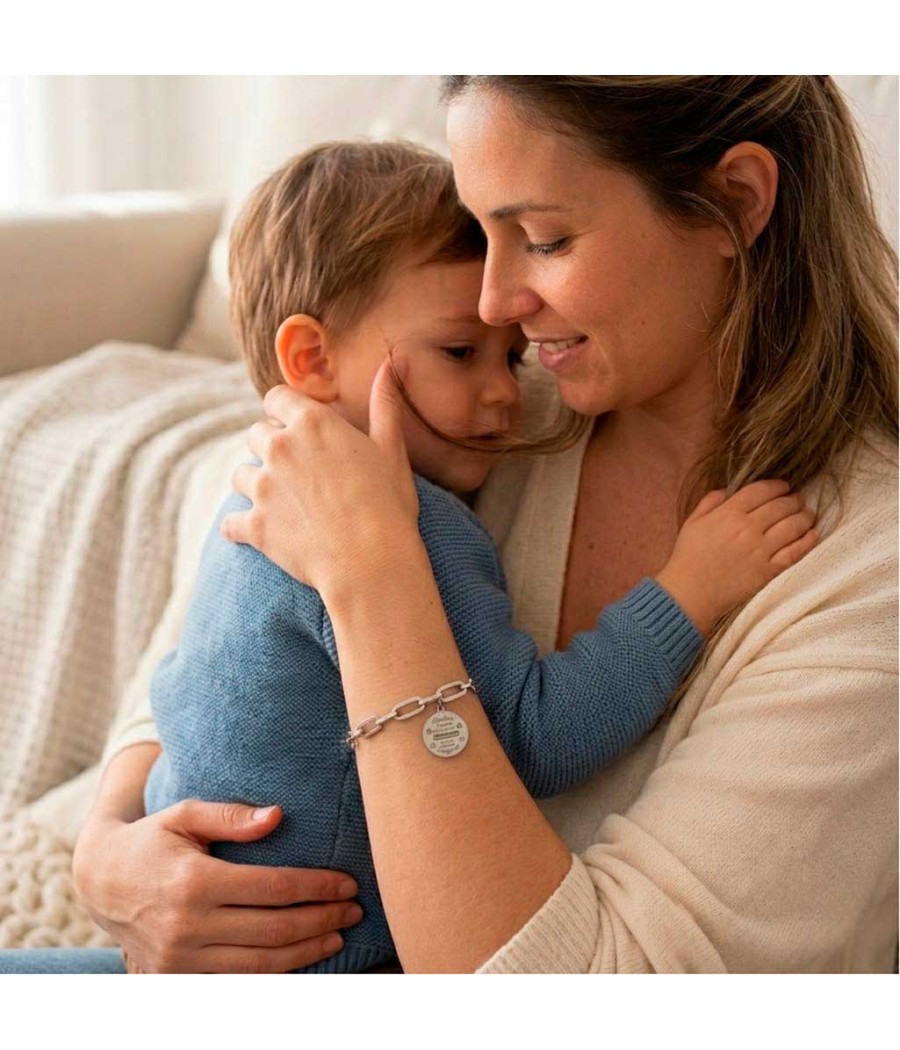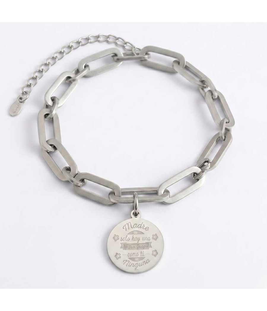 Pulsera de acero con medalla grabada con el texto: Madre solo hay una y tan guapa como tú ninguna.