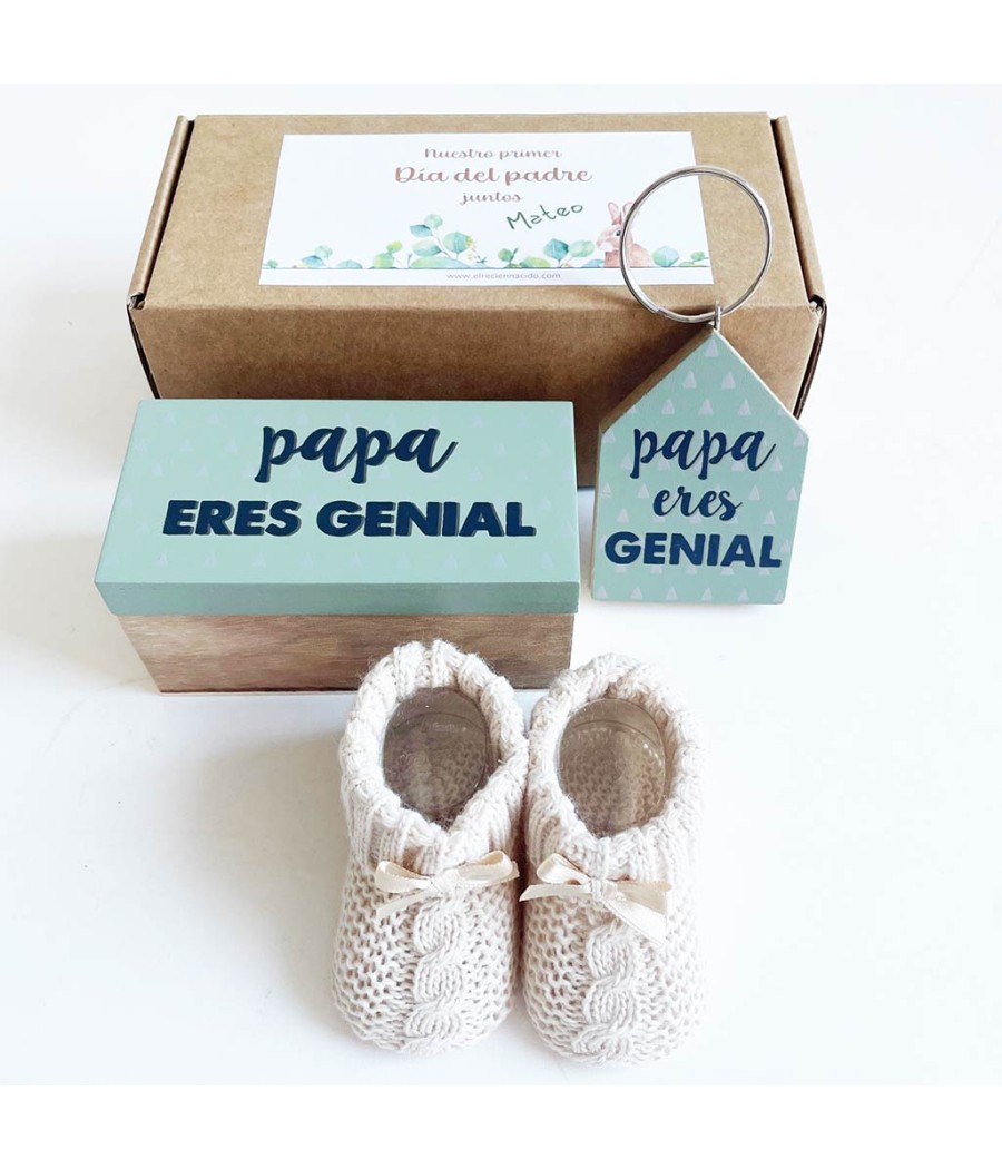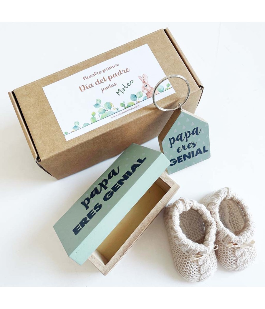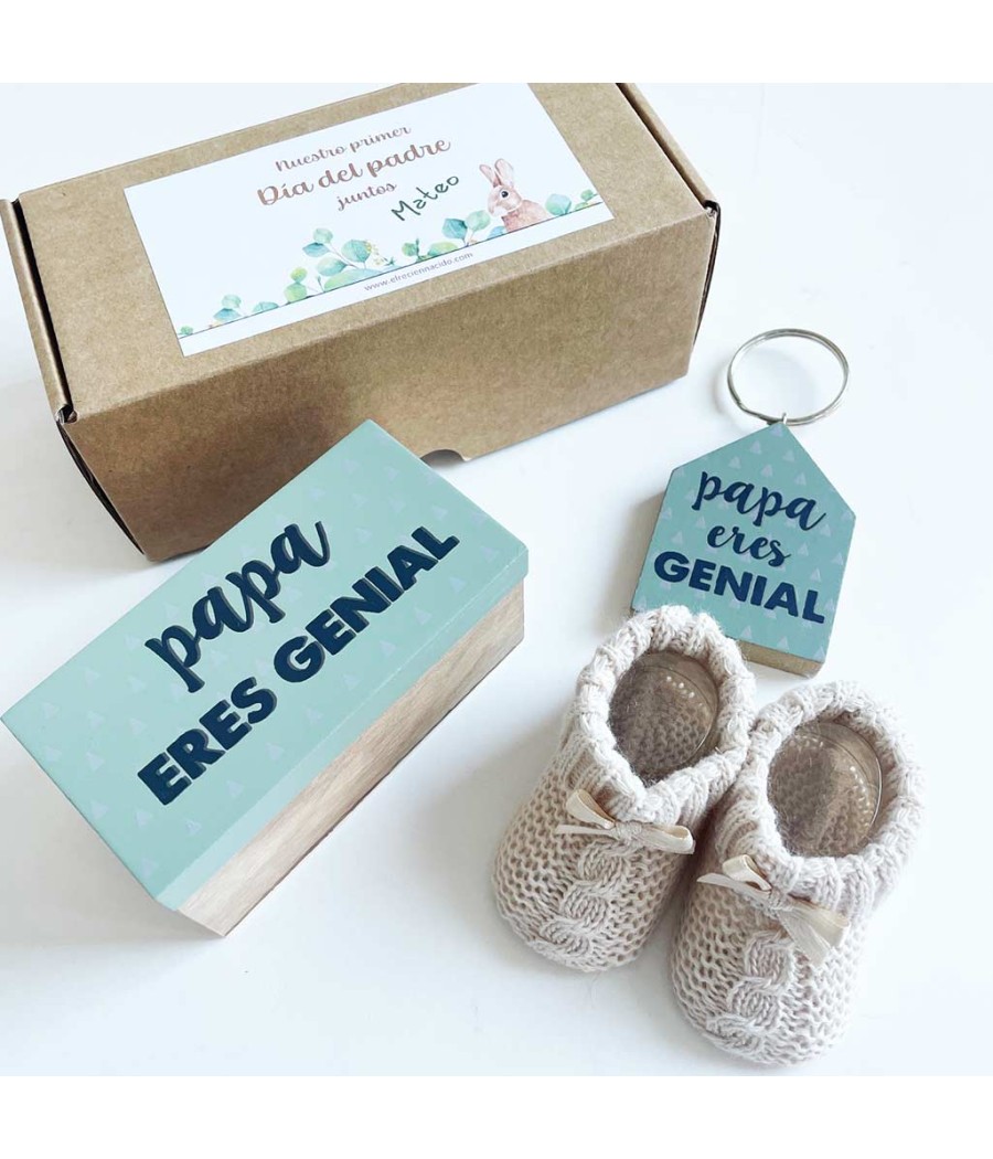Un divertido set para regalar a papás primerizos. Un llavero de madera y una cajita a juego "Papá eres genial" con unos patucos para el bebé. Todo presentado en una caja ecológica kraft con una dedicatoria muy bonita y firmada con el nombre del bebé.