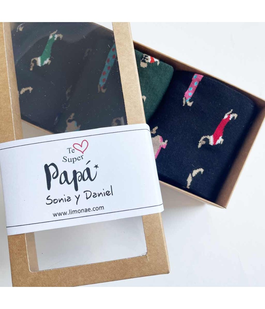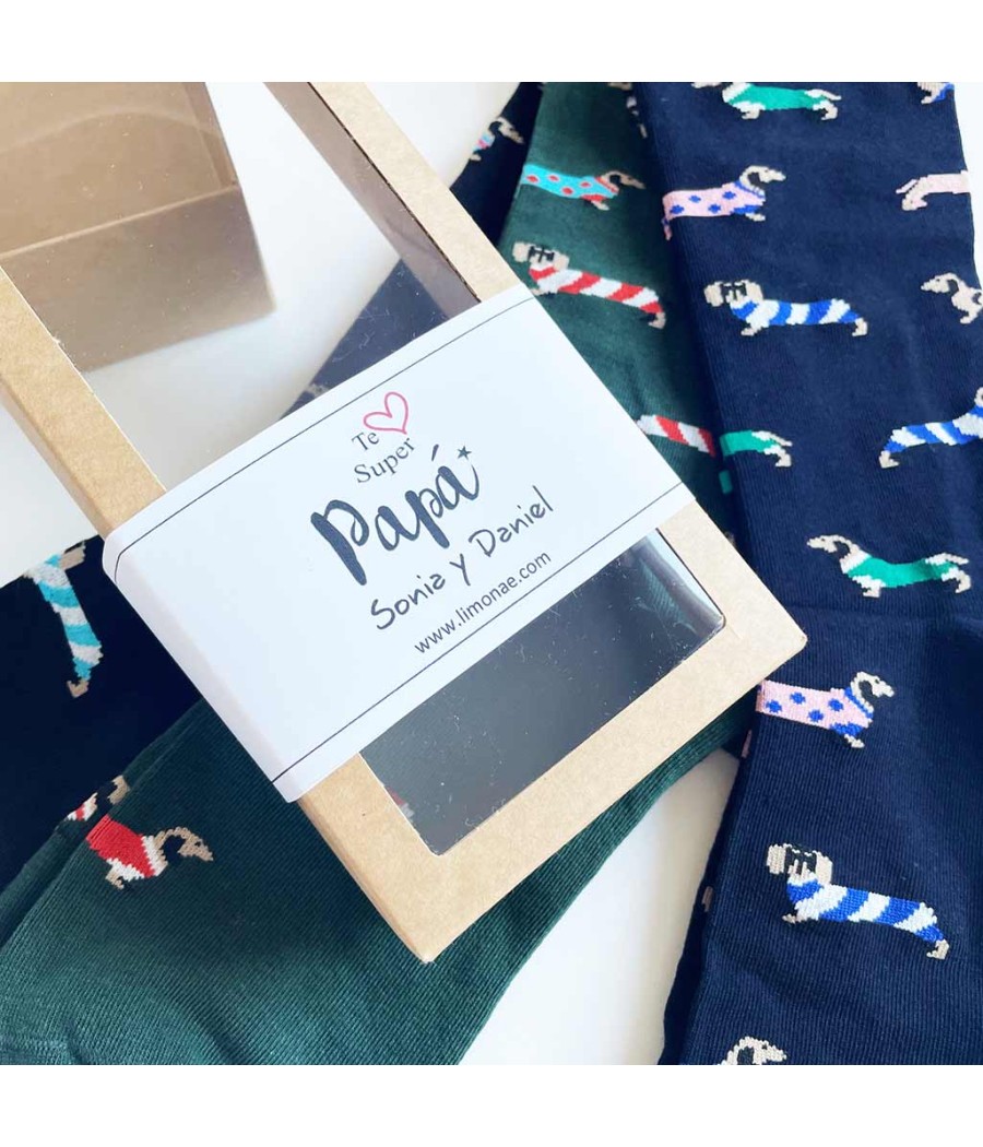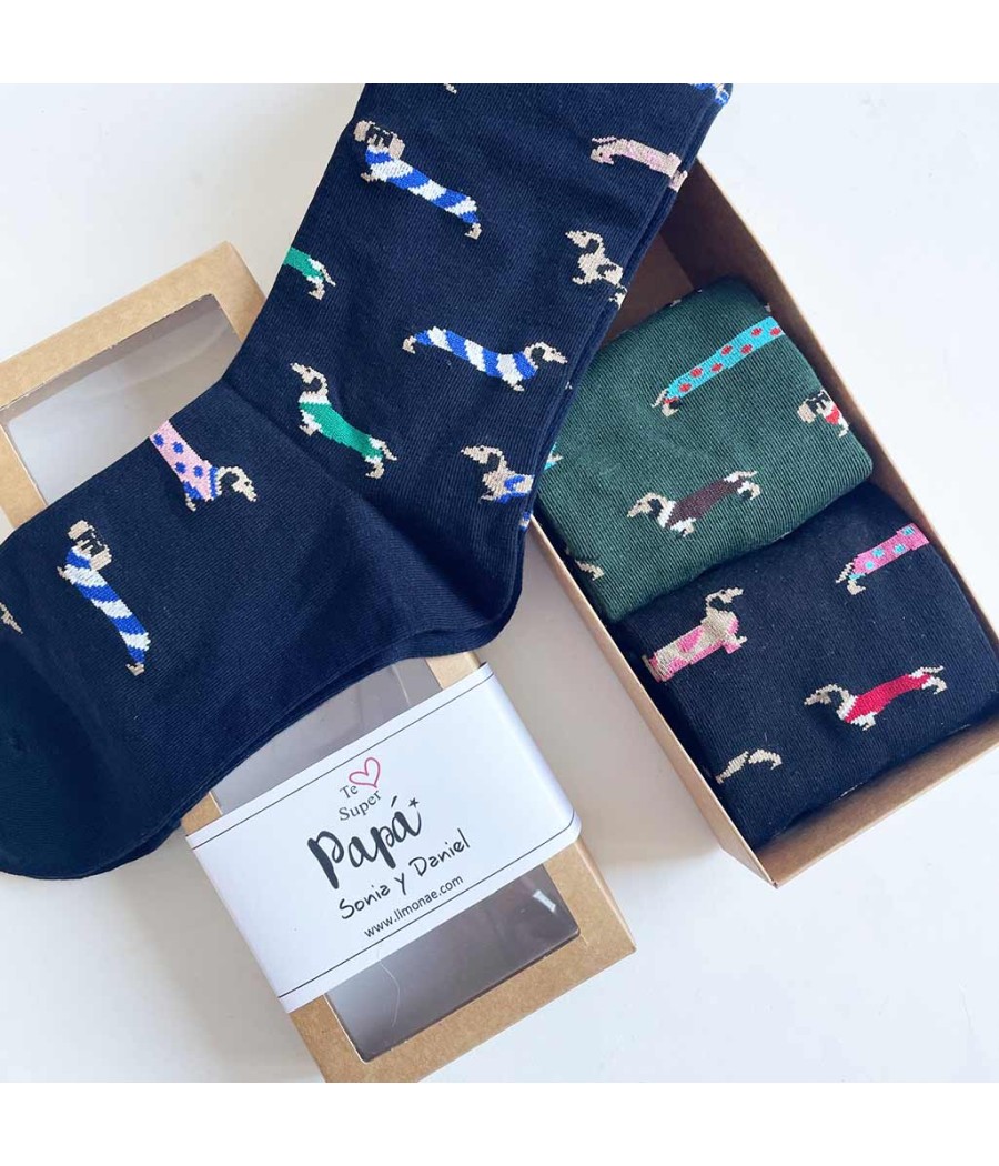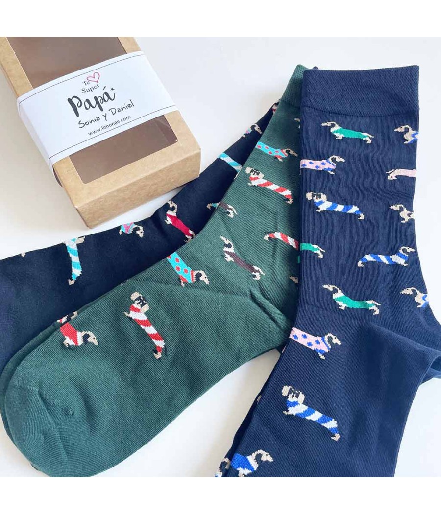 Set de 3 pares de calcetines divertidos con perritos teckel surtidos de colores para regalar el día del padre.