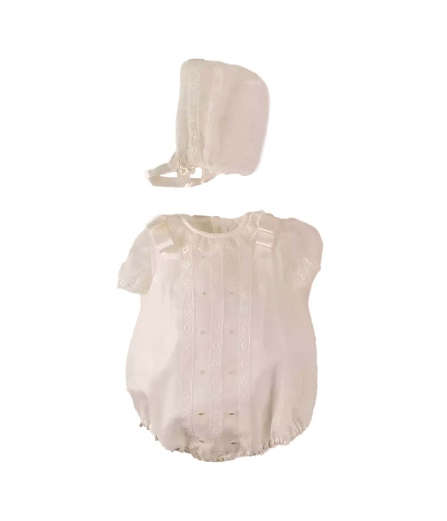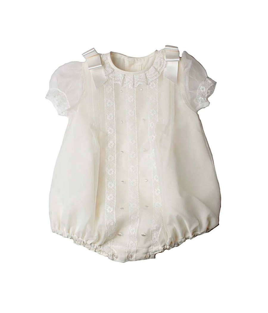 Pelele de bautismo talla única de 6-12m. Pelele de cristal en crema con pequeños encajes y lazos. Fabricado en España.